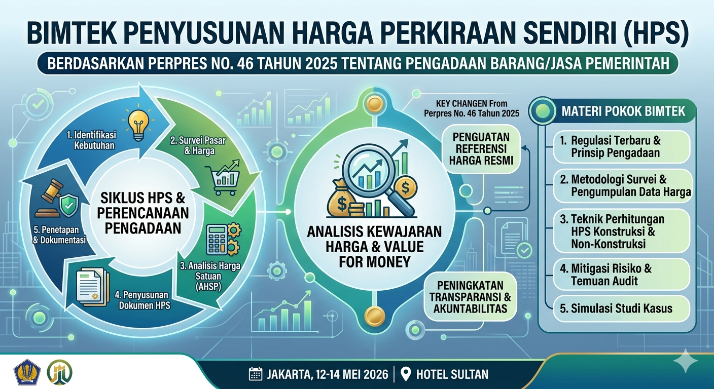 Bimbingan Teknis (Bimtek) Penyusunan Harga Perkiraan Sendiri (HPS) Berdasarkan Perpres No. 46 Tahun 2025 adalah program pelatihan vital bagi Pejabat Pembuat Komitmen (PPK), Pejabat Pengadaan, dan Pokja Pemilihan dalam ekosistem pengadaan barang/jasa pemerintah. Bimtek ini dirancang untuk memberikan pemahaman mendalam dan keterampilan praktis dalam menetapkan HPS yang akurat, kredibel, dan akuntabel, menyesuaikan dengan dinamika aturan terbaru yang diperkenalkan oleh Perpres No. 46 Tahun 2025 tentang Pengadaan Barang/Jasa Pemerintah.