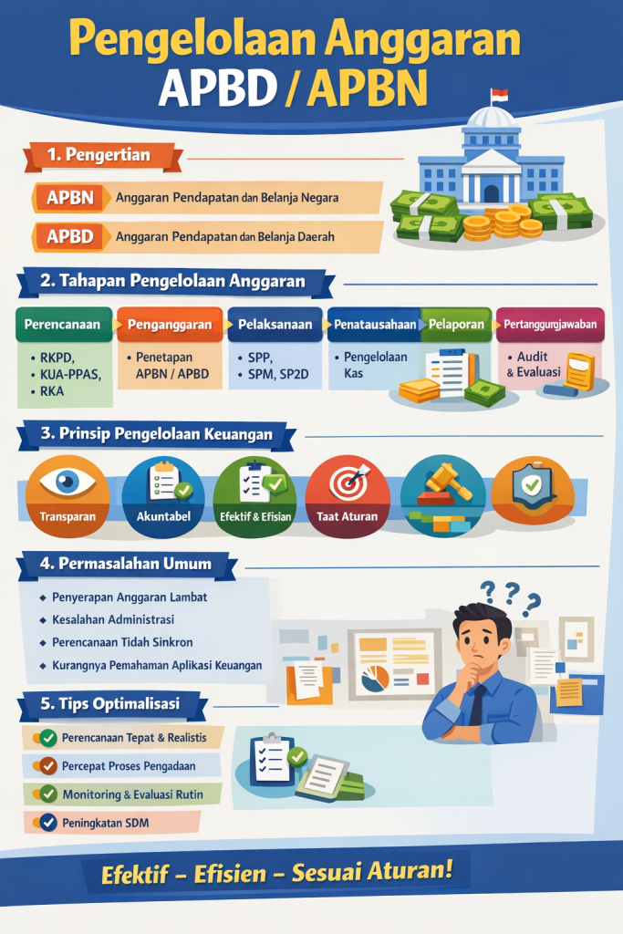 Pengelolaan Anggaran (APBD/APBN) Tahun 2026 merupakan proses strategis dalam memastikan perencanaan, pelaksanaan, dan pertanggungjawaban keuangan negara dan daerah berjalan secara efektif, efisien, transparan, dan akuntabel. Materi ini membahas secara komprehensif siklus pengelolaan anggaran yang meliputi tahap perencanaan, penganggaran, pelaksanaan, penatausahaan, hingga pelaporan dan evaluasi. Selain itu, peserta akan memahami struktur anggaran yang terdiri dari pendapatan, belanja, dan pembiayaan, serta prinsip-prinsip utama dalam pengelolaan keuangan publik.